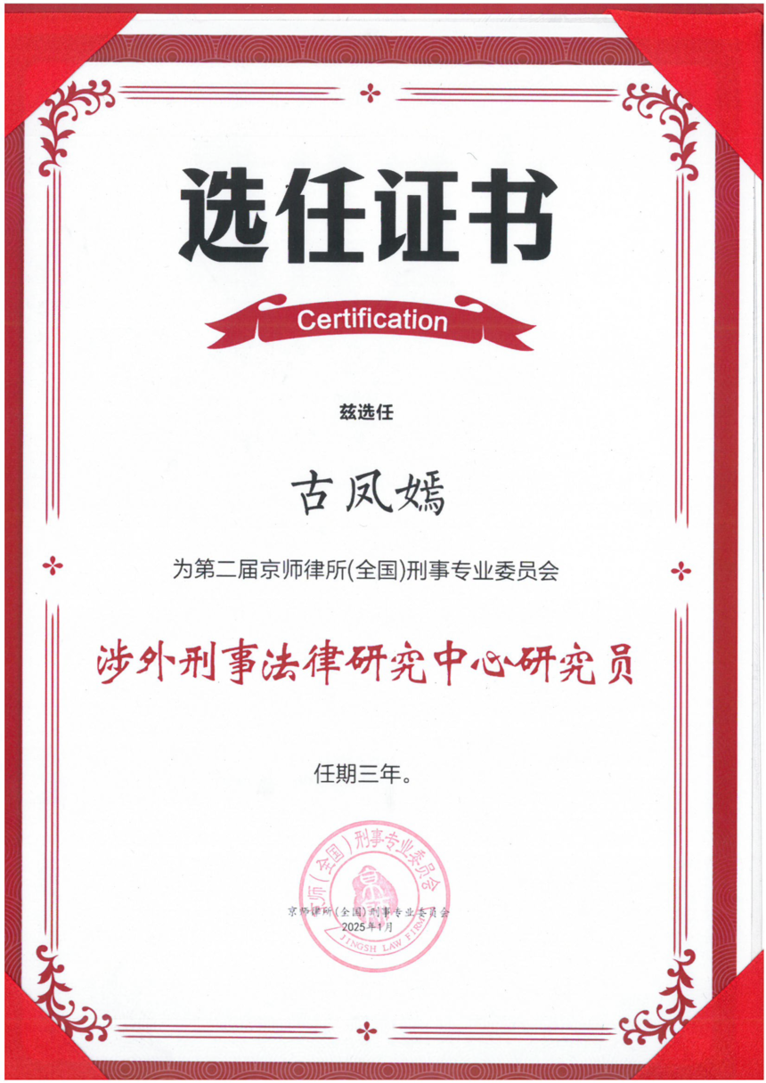 黄玲律师 律师简介 北京市京师(中山)律师事务所女律师工作委员会副主任、关心下一代工作委员会副主任、国际法律事务部成员、京师律所(华南区)刑事专业委员会理事。 中山市涉外法律专业委员会委员、中山市新《公司法》宣讲团成员、广东狮子会会员。 擅长领域 企业常年法律顾问服务、上市公司与非上市公众股份公司风控治理体系搭建、股权架构设计、外资企业全流程法律服务、跨境投资与民商事业务。 杨雪欣律师 律师简介 北京市京师(中山)律师事务所党支部纪检委员、妇女联合会主席、工会副主席、青年律师工作委员会副主任、公司结业与破产清算法律事务部主任、京师律所(华南区)刑事专业委员会理事。 中山市律师协会党建委委员、中山市木兰巾帼志愿服务队队委、培训分队副队长。 擅长领域 公司结业、刑事辩护、民商事、知识产权法、债权债务、婚姻、继承、工伤劳动争议、人身损害赔偿、交通事故等。 谭德勇律师 律师简介 北京市京师(中山)律师事务所建筑工程法律事务部主任、京师律所(华南区)刑事专业委员会理事。 中山市律师协会民营企业服务工作委员会委员、房地产法律专业委员会委员、建筑工程法律专业委员会委员。 擅长领域 建设工程与房地产、合同争议解决、公司法律事务,有十七年建筑工程师经验,精通建设工程法律事务。 古凤嫣律师 律师简介 北京市京师(中山)律师事务所执业律师、妇女联合会委员、建筑工程法律事务部成员、京师律所(华南区)刑事专业委员会理事。 中山市律师协会粤港澳大湾区与“一带一路”工作委员会副秘书长、建筑工程法律专业委员会委员、中山市涉外律师后备人才、中山市台湾同胞台胞亲属联谊会第十一届理事会成员。 擅长领域 建设工程领域、公司常年法律顾问、民商事纠纷处理(如劳动工伤争议、债权债务、人身损害、合同纠纷等)、刑事辩护。 杨若琪律师 律师简介 毕业于广东外语外贸大学,法学学士学位,现为北京市京师(中山)律师事务所执业律师,中山市新《公司法》宣讲团成员。执业以来办理多起劳资纠纷、合同纠纷、民间借贷等案件,为企业提供常年法律顾问、诉讼及非诉专项法律服务及诉讼代理等法律服务。 擅长领域 公司常年法律顾问、民商事争议解决(劳动工伤争议、债权债务、人身损害、婚姻家事等)。 关于京师刑委会涉外刑事法律研究中心 一、研究中心简介 二、研究中心优势 研究中心成员律师在处理涉外案件时,能够充分发挥国际经验和刑事工作经验丰富的律师专业能力,与国内外机构及人士高效沟通协作,解决涉外刑事案件管辖、立案、跨境取证、当事人合法权利维护、国际司法协助等难题。 A、本研究中心多位律师具有丰富的涉外办案或国内刑事司法机关实践工作经验,这些经历使他们在理解司法程序和司法机关的立场上具有独特优势。 B、本研究中心律师成员对复杂案件处理具有经验丰富,律师们成功代理了大量重大、疑难跨境刑事案件。 C、本研究中心律师成员法学功底深厚、论文专著研究成果丰富。例如:李毅然律师创作了《中华人民共和国刑法》英译文本、梁玮律师发表专著《虚拟货币类犯罪法律实务》。 D、本研究中心律师成员涉外案件沟通处理经验丰富与工作语言多元化。各成员律师在涉外刑事领域有丰富的实践经验,涉外刑事案件时能够无障碍地与外籍当事人及其家属沟通交流。 E、中心成员具有跨境刑事专业领域的业务专长。成员律师在跨境刑事案件领域具有显著优势,能够为当事人提供全方位的刑事法律服务,包括刑事辩护、刑事控告、刑事风险评估、刑事危机应对、刑事合规咨询等。 |